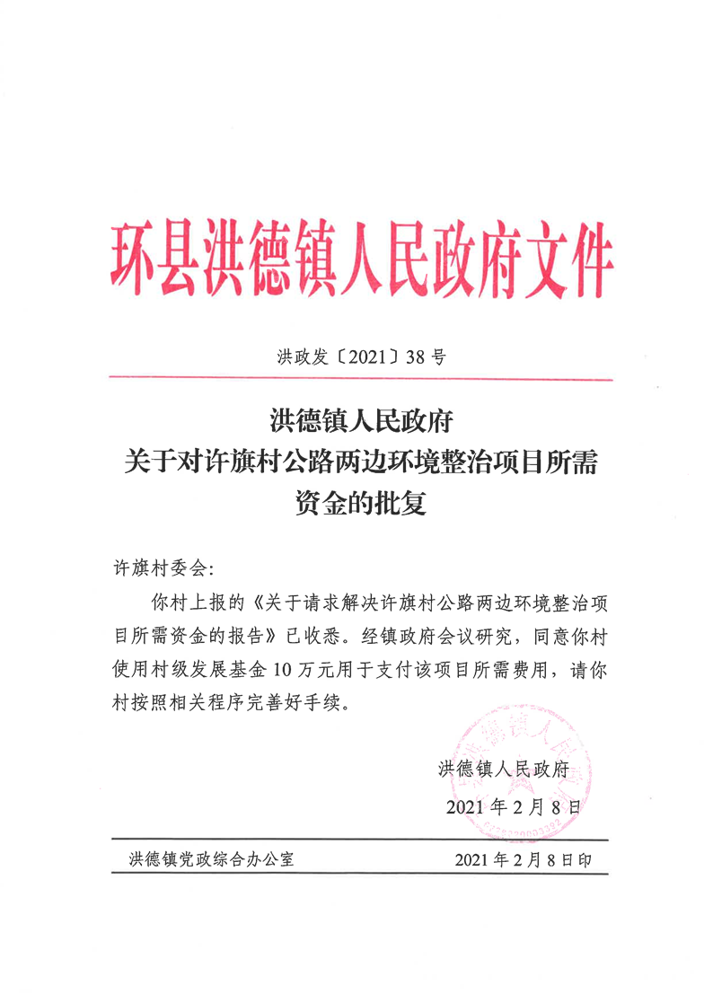 索引号: hd-2021-00028 发布机构: 生效日期: 2021-02-08 废止日期: 文 号: 所属主题: 部门文件 洪德镇人民政府 关于对许旗村公路两边环境整治项目所需资金的批复 时间:2021-02-08 【字体:小 大】 扫一扫分享到朋友圈 【打印正文】 分享到: 【字体:小 大】