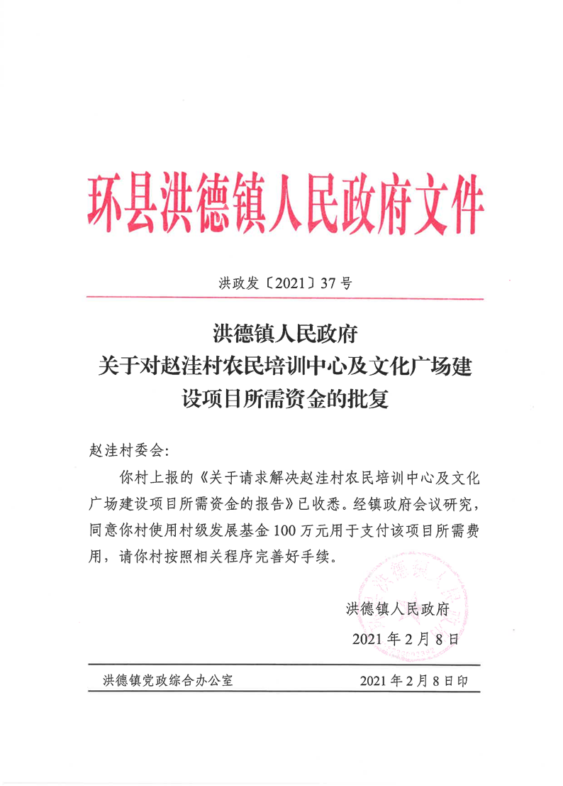 索引号: hd-2021-00029 发布机构: 生效日期: 2021-02-08 废止日期: 文 号: 所属主题: 部门文件 洪德镇人民政府 关于对赵洼村农民培训中心及文化广场建设项目所需资金的批复 时间:2021-02-08 【字体:小 大】 扫一扫分享到朋友圈 【打印正文】 分享到: 【字体:小 大】