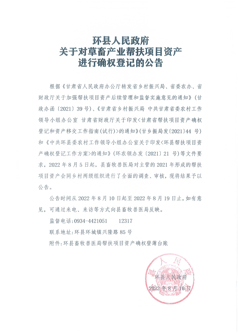 关于对草畜产业帮扶项目资产进行确权登记的公告 发布时间:2022-08-10 08:30:03 【字体:小 大】 环县畜牧兽医局帮扶项目资产确权登簿台账(1).xlsx 扫一扫分享到朋友圈 【打印正文】