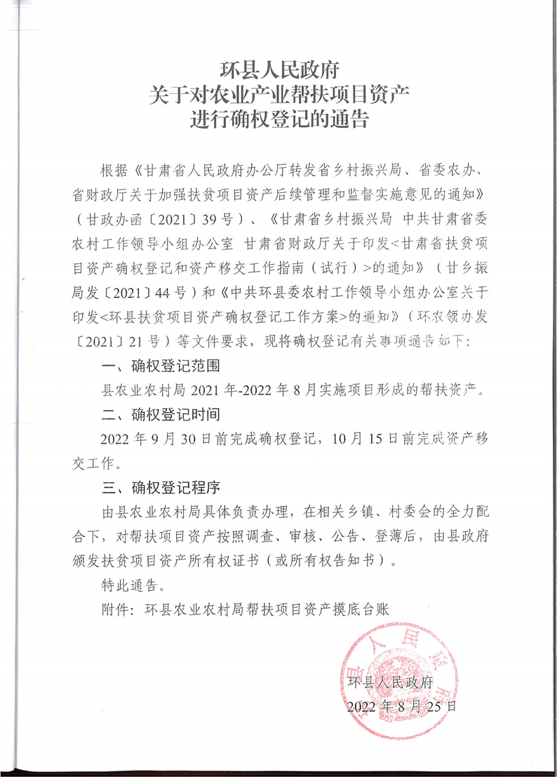 关于对农业产业帮扶项目资产进行确权登记的通告 发布时间:2022-08-25 15:05:47 【字体:小 大】 摸底台账2022年(1).xlsx环县农业农村局帮扶项目资产摸底台账2021(1).xlsx 扫一扫分享到朋友圈 【打印正文】