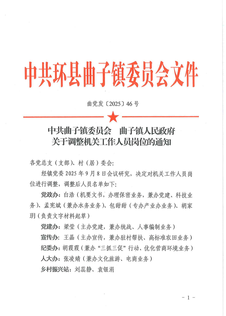 索引号: qzz-2025-00079 发布机构: 生效日期: 2025-09-18 废止日期: 文 号: 所属主题: 部门文件 中共曲子镇委员会 曲子镇人民政府关于调整机关工作人员岗位的通知 时间:2025-09-18 【字体:小 大】 扫一扫分享到朋友圈 【打印正文】 分享到: 【字体:小 大】